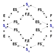 We are developing mass spectometry techniques to measure phospho-form distributions. This will enable us to undertake the in-vitro thought experiment on the previous page, with real substrates and enzymes. The rational parameterisation theorem predicts an upper bound for the dimension of the resulting set of points. Can we deduce anything further? Consider a kinase, phosphatase, substrate system with 2 sites, in which both enzymes act distributively, so that at most one modification (either phosphorylation or dephosphorylation) is done at a time. We can show that the steady state concentrations of the four phospho-forms satisfies the quadratic formula a[S01]2 + b[S01][S10] + c[S10]2 = d[S00][S11] where a, b, c, d depend only on the parameters [♦]. This formula holds for any steady state, irrespective of the total amounts of substrate and enzymes and the starting conditions. We call it an invariant. Dividing by the term on the right and treating the expression as a linear form in three new variables, we see that the phospho-form variety, in these new variables, lies on a plane. This condition can be checked without having to know anything at all about the parameter values (which is particularly important because they are almost never known!). If one or the other of the enzymes is processive, so that more than one modification occurs at a time, then the planarity condition no longer holds. However, the phospho-form variety has a different geometry in each of the four possible cases. We can therefore infer details of the underlying biochemical network by simply inspecting the geometry of the steady-state phospho-form variety. Invariants are algebraic consequences of the polynomials in the system's ODEs, which are useful because they do not involve certain variables, particularly the free enzyme concentrations, which are extremely difficult to measure. Algebraic geometry provides the Gröbner basis method for systematically eliminating variables from polynomial equations [♦]. This algorithm is implemented in Mathematica and is one way to find invariants. For an elementary overview of algebraic geometry and Gröbner bases, see [♦]. Guy Shinar and Uri Alon have introduced "absolute concentration robustness" [♦]. A system exhibits this if there is an invariant of the form [X] = a, so that the concentration of X has the same value at steady state, no matter how the system is initiated. This robustness has been experimentally observed in certain bacterial metabolic systems [♦,♦]. An invariant can encode a more complex form of robustness, in which several variables may participate. |